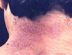 神经性皮炎是一种皮肤功能障碍性疾病,具有明显的皮肤损害。且多发生在颈后部或其两侧、肘窝、腘窝、前臂、大腿、小腿及腰骶部等。常成片出现,呈三角形或多角形的平顶丘疹,皮肤增厚,皮脊突起,皮沟加深,形似苔藓。常呈淡红或淡褐色,剧烈瘙痒是其主要的症状。